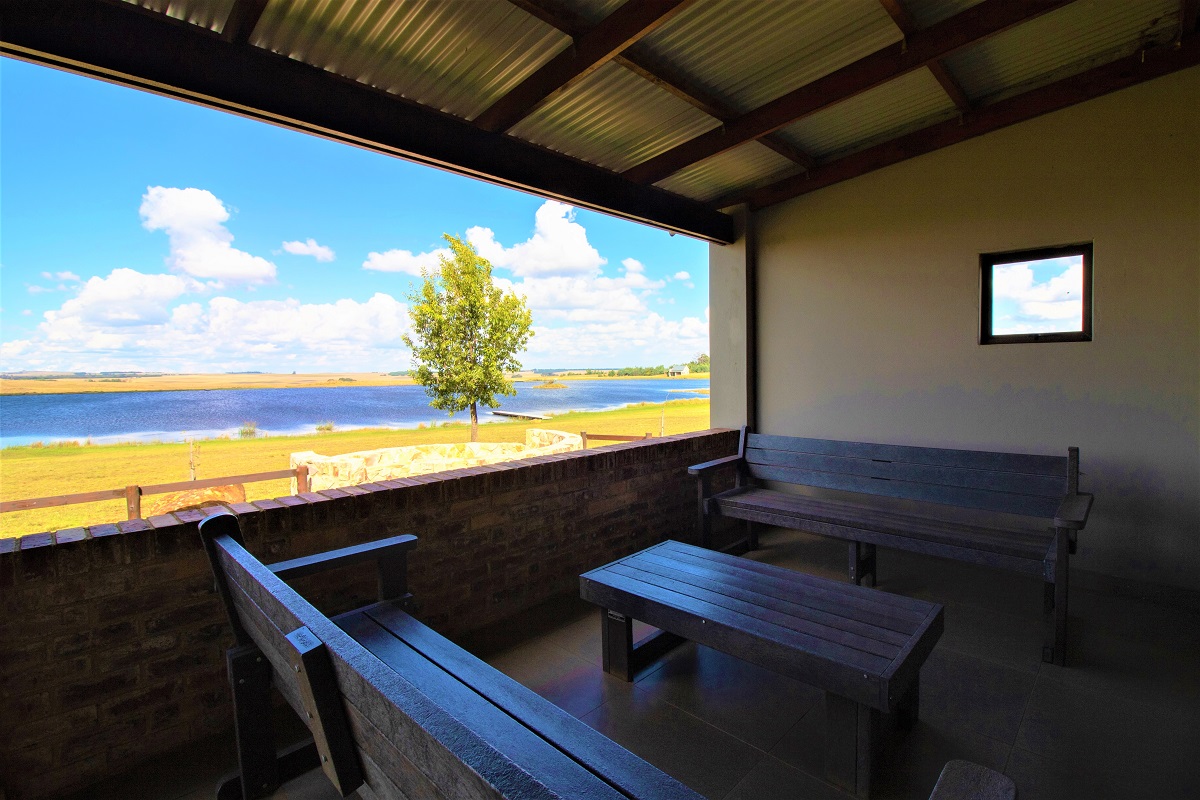 - An enclosed and covered patio with a built-in braai (barbecue), a dining area with chairs, and two benches with a coffee table.